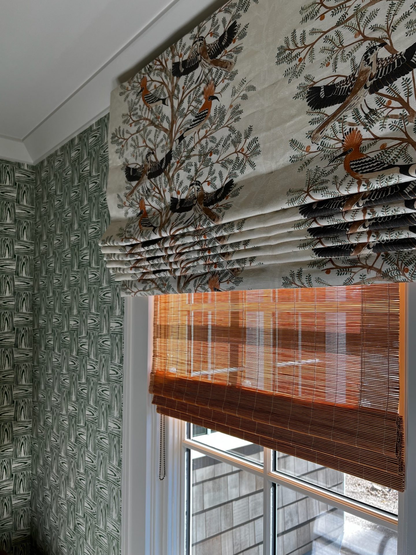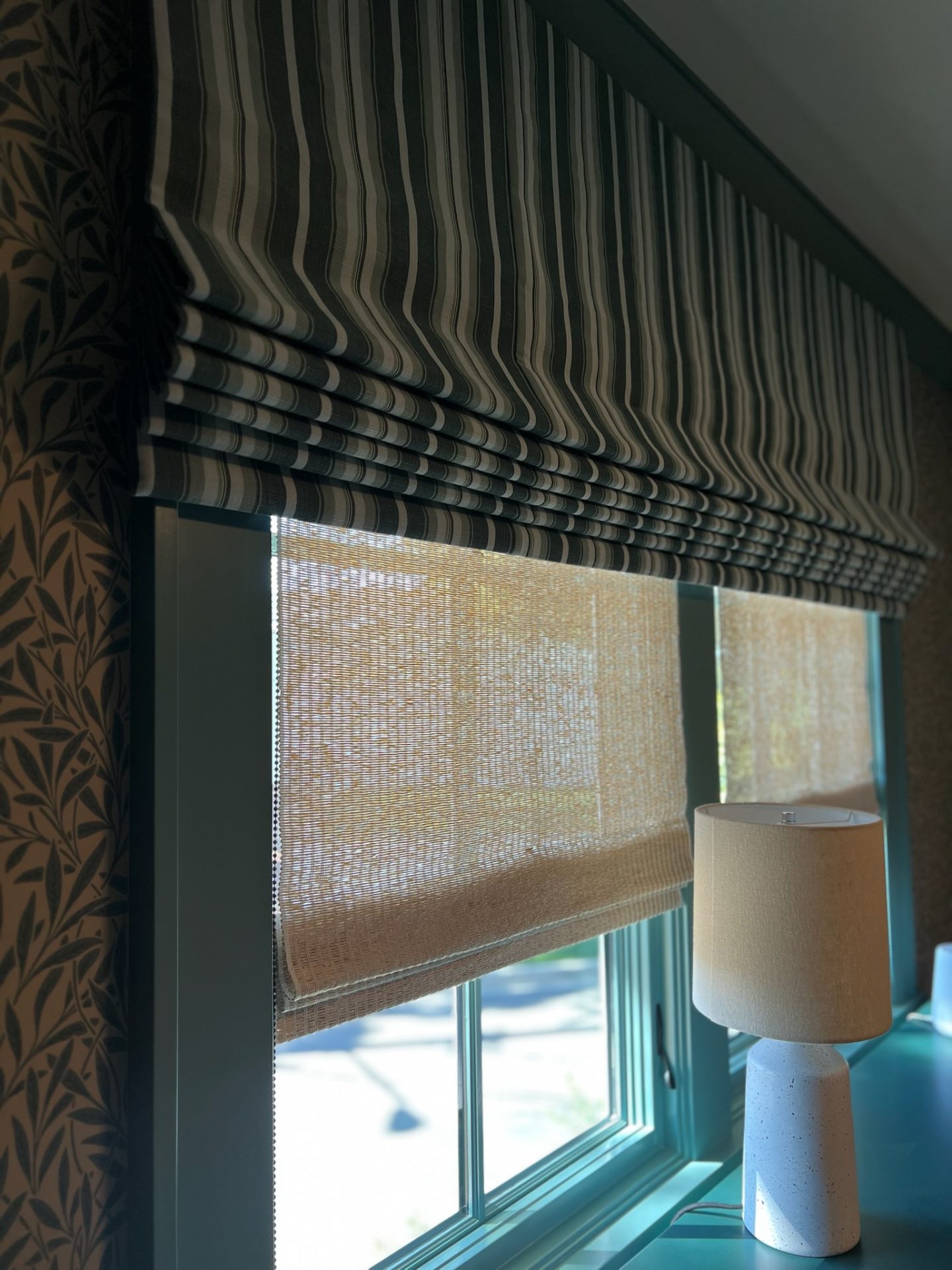 Linen or cotton Romans blend beautifully with bamboo, reed, or grassweave woven shades. The contrast of smooth fabric and tactile fibers makes the window feel alive. Each layer highlights the other — the Roman shade adds softness and color, while the woven shade adds texture and shadow.