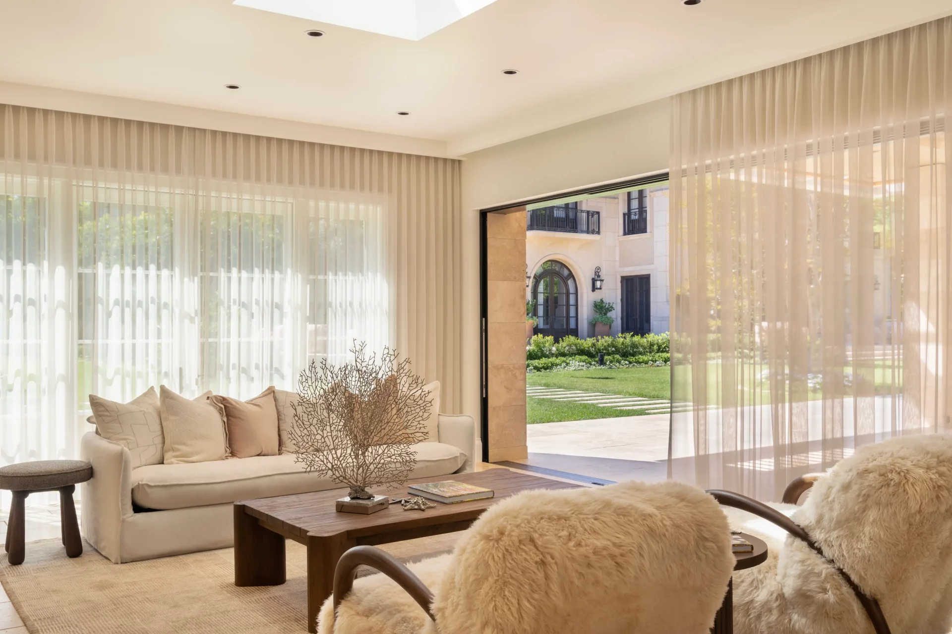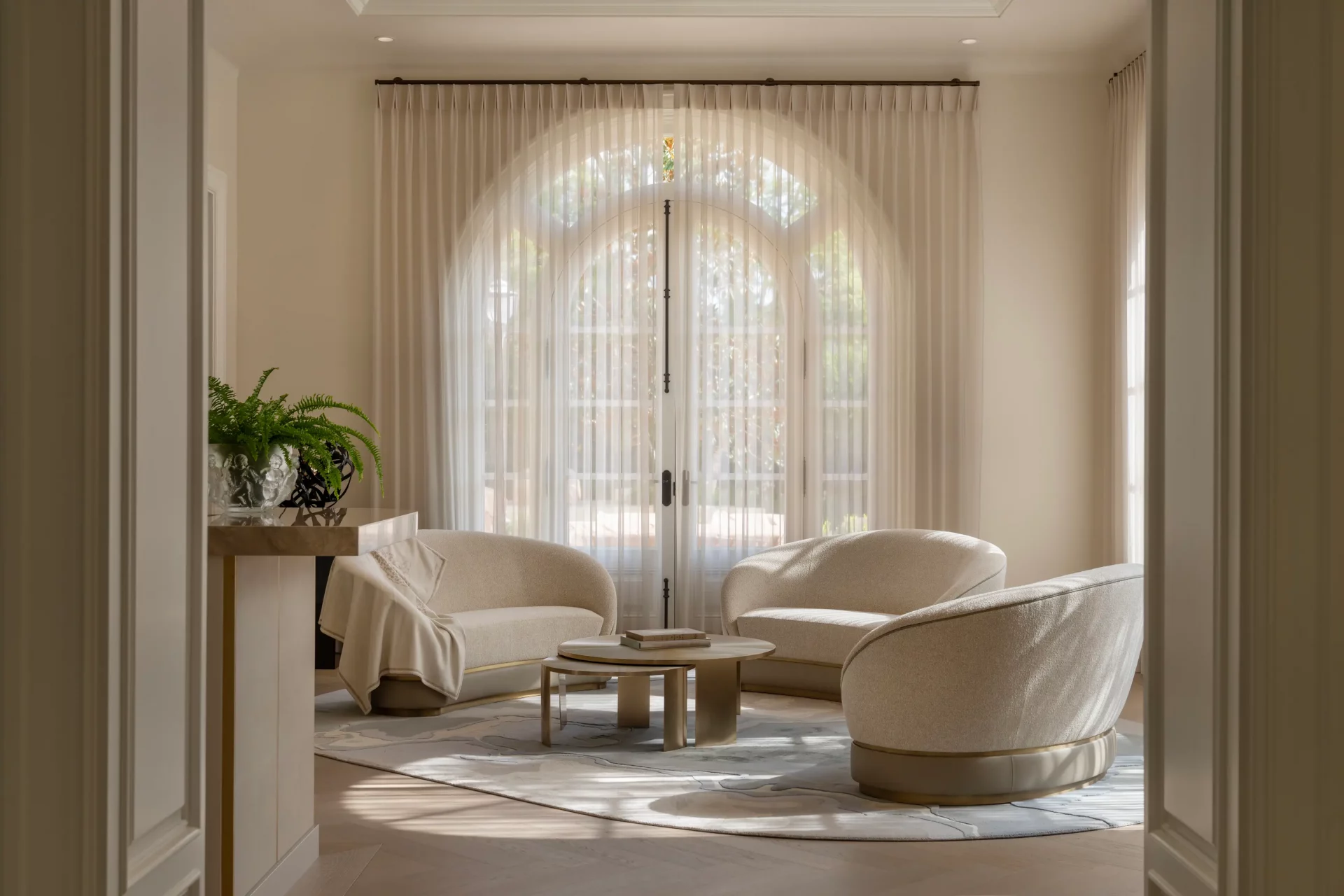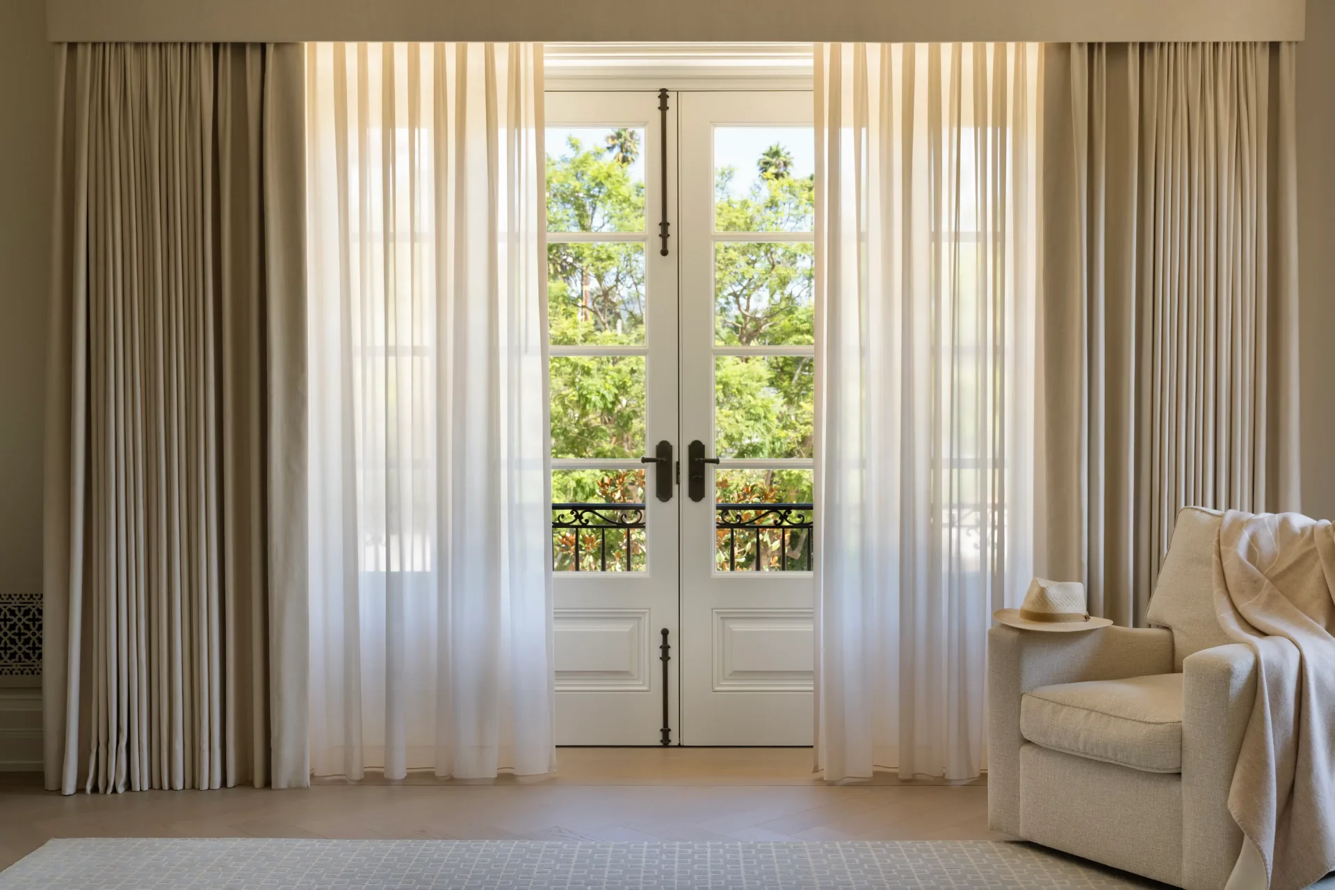 Soft, flowing fabrics frame the windows with quiet elegance, allowing natural light to move freely while adding a refined layer of texture. The design embraces understated luxury – where sheer drapery enhances architecture rather than competing with it.