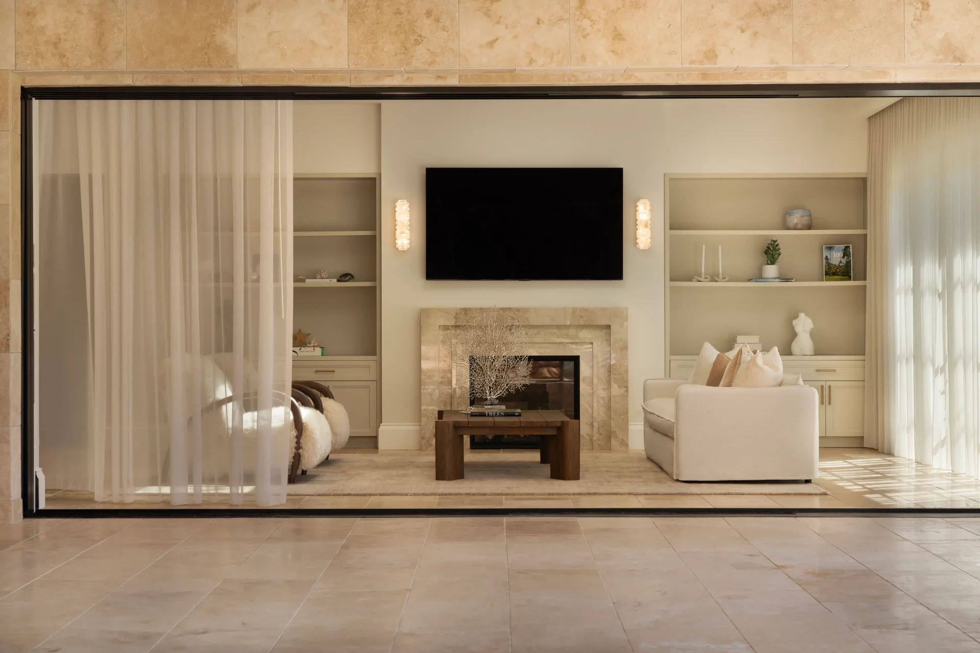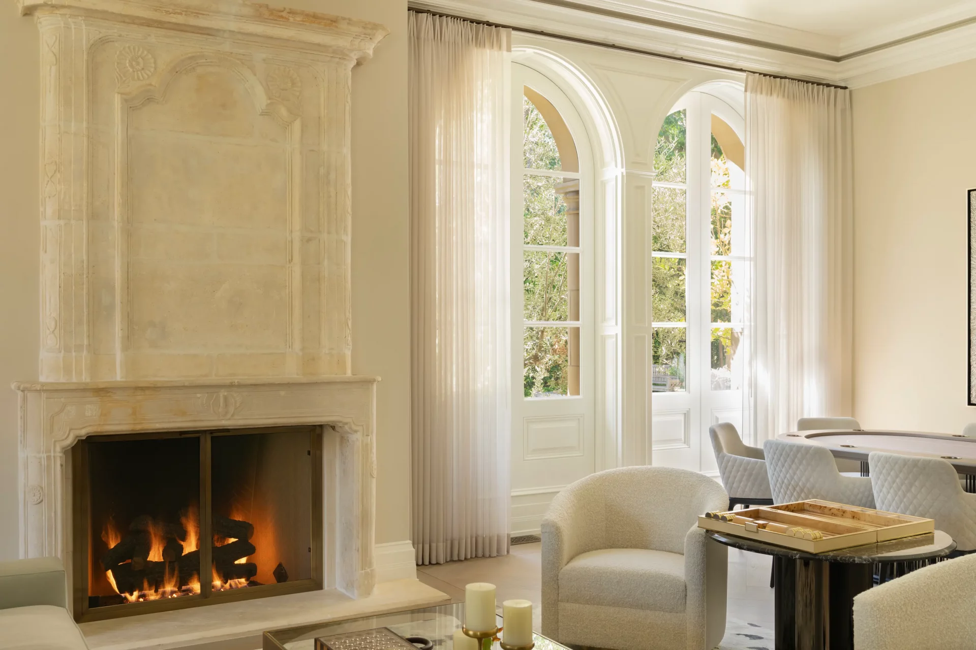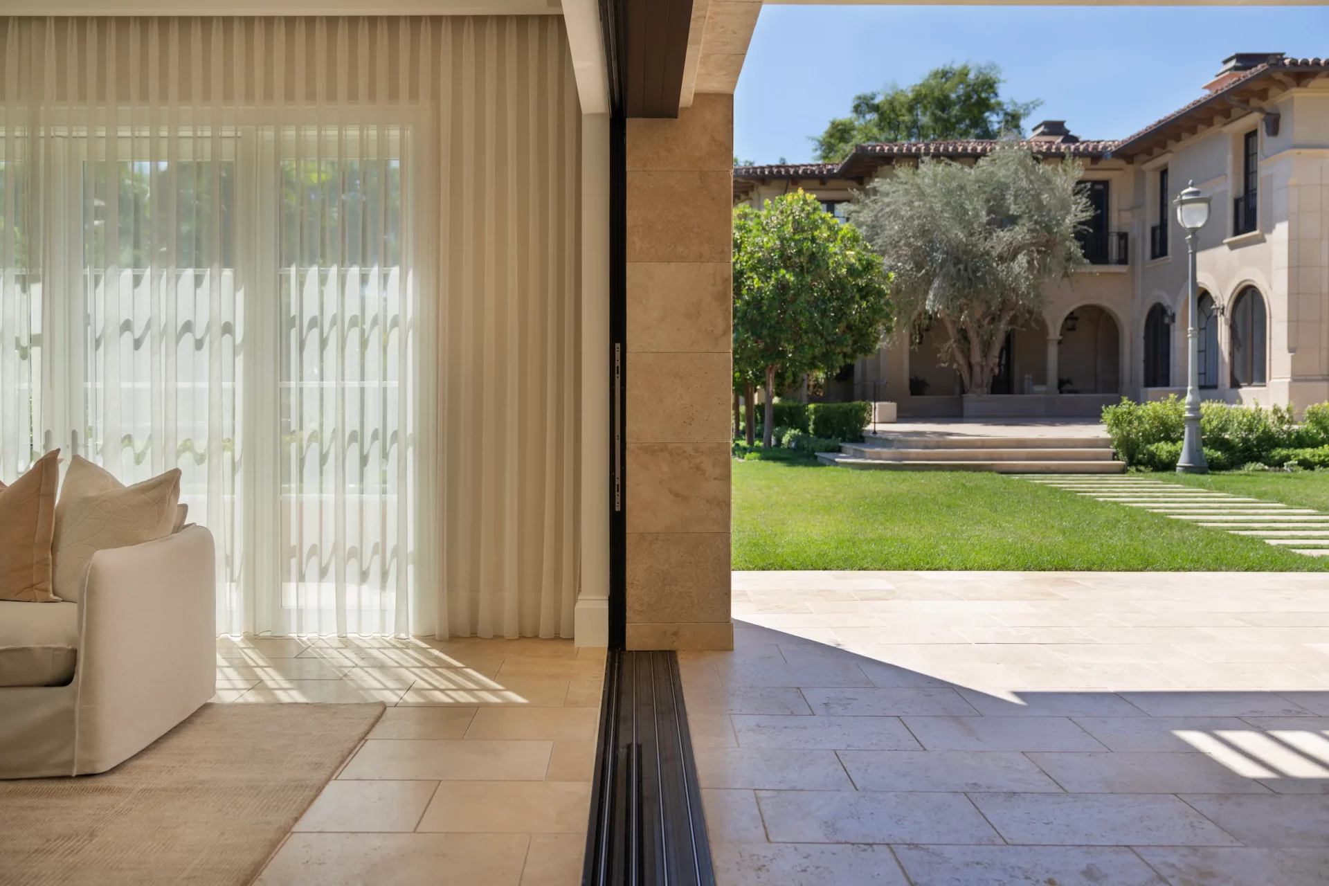 Soft, flowing fabrics frame the windows with quiet elegance, allowing natural light to move freely while adding a refined layer of texture. The design embraces understated luxury – where sheer drapery enhances architecture rather than competing with it.